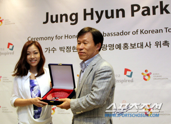박정현인 5일(한국시각) 미국 LA의 다저스타디움에서 열린 LA 다저스-시카고 컵스의 메이저리그에서 애국가와 미국 국가를 부른 뒤 경기장 내 VIP 룸에서 가진 한국관광명예홍보대사 위촉식에서 한국관광공사 심정보 마게팅 본부장(오른쪽)으로부터 위촉패를 받고 있다. 다저스와 한국관광공사는 이날 경기에 앞서 '코리안 나이트' 행사를 열어 박정현이 애국가와 미국 국가를 불렀고, 국기원 태권도 시범단이 미국 야구 팬들앞에서 태권도 시범을 보여 많은 박수갈채를 받았다. LA=이사부 기자 golf@sportschosun.com