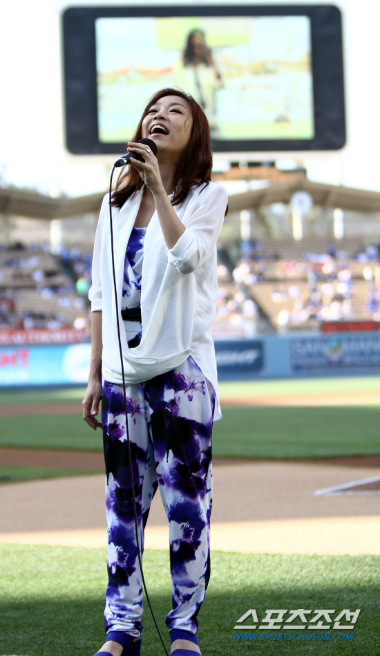 가수 박정현이 5일(한국시간) 미국 LA의 다저스타디움에서 다저스와 시카고 컵스의 메이저리그 경기에 앞서 애국가를 부르고 있다. 이날 다저스는 한국관광공사와 함께 '코리안 나이트' 행사를 열어 박정현이 애국가와 미국 국가를 불렀고, 국기원 태권도 시범단이 미국 관중 앞에서 태권도 시범을 보여 많은 박수갈채를 받았다. LA=이사부 기자 golf@sportschosun.com