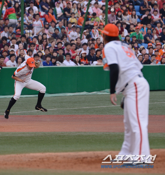 오선진 본인은 어떨까. 그에게 3루 수비에 대한 어려움을 묻자 "빗맞은 타구도 많고, 처음엔 타구에 따라 앞뒤 어떤 스텝을 밟아야 될지 고민되는 일이 많았다"고 했다.