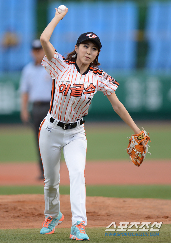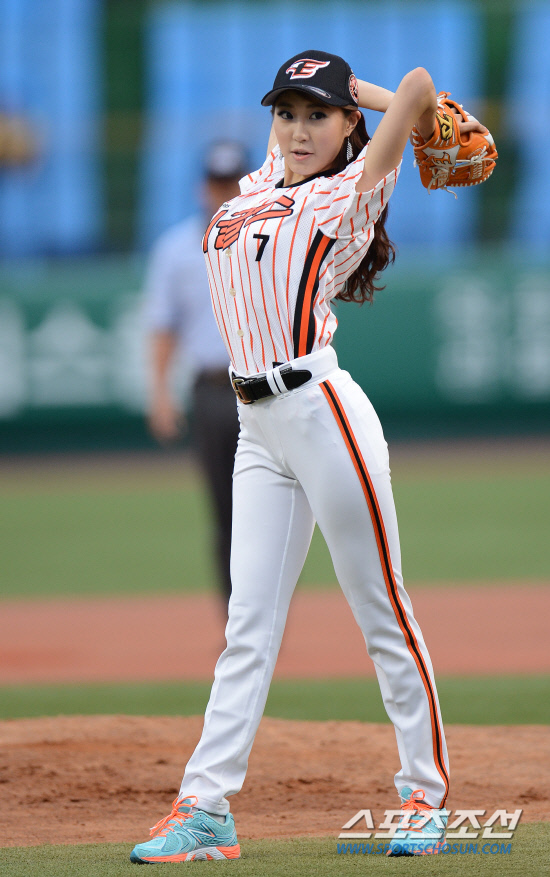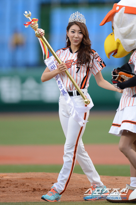 9일 대전구장에서 2012 프로야구 두산과 한화의 주중 3연전 마지막 경기가 열렸다. 미스코리아 대전 충남 진 한승희가 경기 전 시구를 위해 마운드에 오르고 있다. 한승희는 그라운드에 1억원을 호가하는 다이아몬드 왕관과 봉을 들고 등장해 눈길을 끌었다.