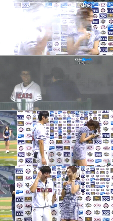 이를 본 김재호는 "괜찮냐. 죄송하다"며 정 아나운서에 사과했고, 동시에 중계화면에는 물을 뿌리고 뛰어 들어가는 김현수의 모습이 포착됐다.