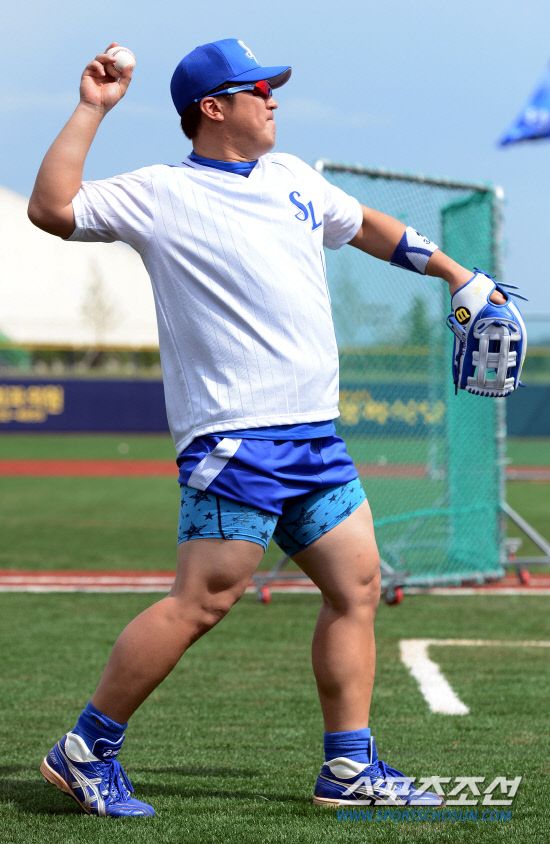 프로야구 삼성과 한화의 경기를 앞둔 15일 포항야구장. 최형우가 바지를 걷고 캐치볼 훈련을 하고 있다. 포항=전준엽 기자 noodle@sportschosun.com/2012.08.15/