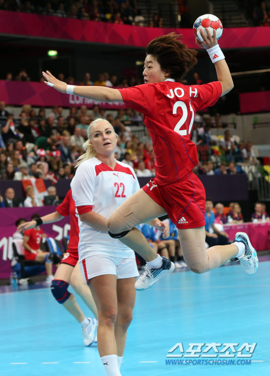 | 한국 여자 핸드볼대표팀 조효비가 덴마크전에서 수비를 뚫고 슛을 날리고 있다. 조효비는 18일 인천문학구장에서 열리는 SK-KIA전 시구를 한다. 런던=올림픽사진공동취재단 |