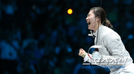 | 김지연이 펜싱 여자 사브르 결승전서 승리한 뒤 환호하고있다. 김지연은 19일 인천 SK-KIA전서 시구를 한다. 런던=올림픽사진공동취재단 |