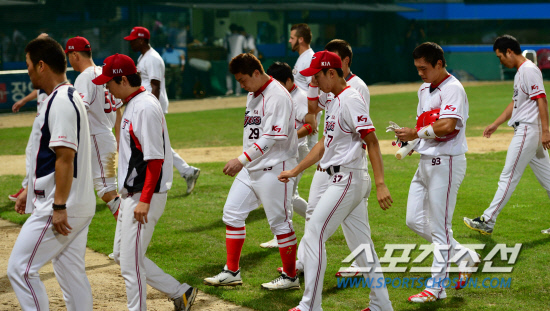 21일 광주구장에서 2012 프로야구 LG와 KIA의 주중 3연전 첫 경기가 열렸다. LG의 활화산 타선에 밀려 2대8로 대패, 7연패의 늪에 빠진 KIA 선수들이 관중에게 인사를 한 후 고개를 숙인 채 들어가고 있다. 광주=정재근 기자 cjg@sportschosun.com