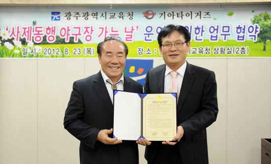 KIA가 광주광역시 교육청과 손을 잡고 야구를 접목한 교육 프로그램 추진에 적극 나선다. KIA는 23일 광주 교육청 교육감실에서 김조호 단장과 광주시교육청 장휘국 교육감 등이 참석한 가운데 업무 협약 체결식을 가졌다. KIA와 광주 교육청은 '샘과의 야구장 데이트' 프로그램을 공동 추진하게 된다. 세부 프로그램으로는 우리가족 야구장 가는 날 샘과의 야구장 데이트 광주 교육가족의 날 교육복지학교 야구장 이벤트 지원 등이 있다. 이날 협약식은 상호 동반자 관계 구축을 통한 지역교육의 발전과 구단의 사회공헌활동 활성화를 모색하기 위한 취지로 이뤄졌다. KIA 김조호 단장은 "이번 업무협약을 계기로 지역 초·중교 학생들에게 꿈과 희망을 심어주고 지역 사랑을 선도하며, 인재 양성을 위해 힘을 모으는 의미 있는 행사들을 앞으로 지속적으로 진행해 나가겠다"고 말했다.