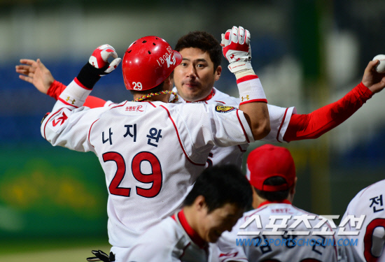 홈런 친 후배 나지완을 반갑게 맞이하고 있는 서재응. 정재근 기자 cjg@sportschosun.com