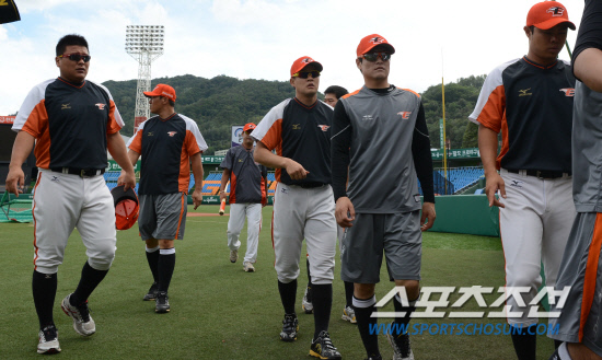 한화 한대화 감독의 전격적인 사임으로 침울한 선수단. 28일 김태균등 선수들이 무거운 표정으로 그라운드에 나서고 있다. 대전=전준엽 기자 noodle@sportschosun.com