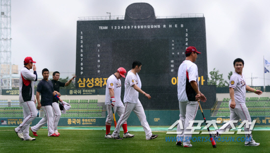 | 비로 취소되기 전 타격 훈련 중인 KIA 선수들. 송정헌 기자 songs@sportschosun.com/2012.7.14 |