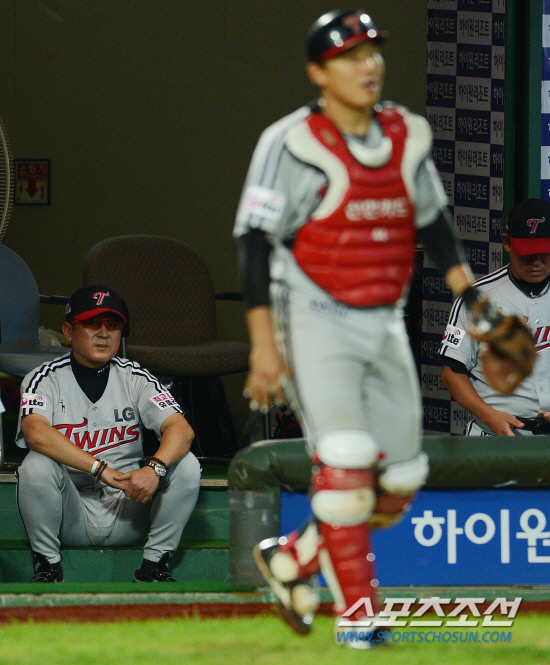 프로야구 롯데와 LG의 경기가 31일 부산 사직야구장에서 펼쳐졌다. 김기태 감독이 4회말 2사 1루 홍성흔의 타석때 윤요섭이 리즈의 투구를 빠트려 1루주자 강민호를 3루까지 진루 시키자 물끄러미 바라보고 있다.부산=전준엽 기자 noodle@sportschosun.com