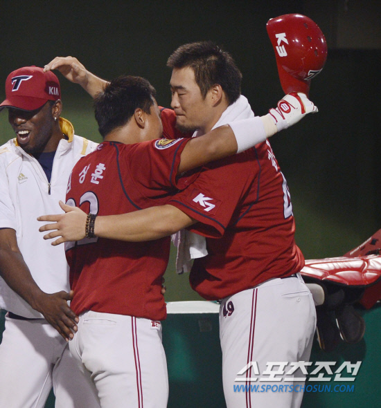 2일 오후 대전 한밭야구장에서 2012 프로야구 한화와 KIA의 경기가 열렸다. 6회초 1사 만루서 KIA 김상훈이 우중월 만루홈런을 친 후 덕아웃에서 선발투수 김진우와 포옹을 나누고 있다. 대전=김경민 기자 kyungmin@sportschosun.com