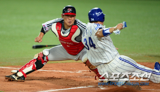 4일 대구시민야구장에서 열린 프로야구 삼성과 LG의 경기 2회 1사 3루에서 삼성 최형우가 신명철의 외야 뜬 볼 타구 때 3루에서 홈까지 쇄도했으나 아쉽게 태그 아웃 당했다. LG 윤요섭 포수에게 태그 아웃 당하고 있는 최형우. 대구=송정헌 기자 songs@sportschosun.com
