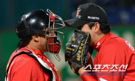 KIA와 SK의 2012 프로야구 경기가 5일 광주 무등구장에서 열렸다. 7회말 1사 2루 KIA 이용규가 타석에 들어오자 SK 윤희상-조인성 배터리가 이야기를 나누고 있다. 광주=허상욱 기자 wook@sportschosun.com/2012.09.05/ |
