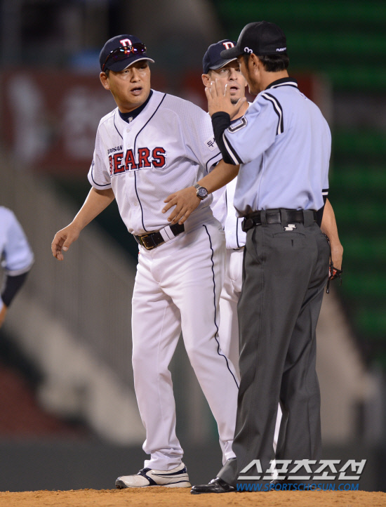 | 7일 잠실 넥센전 연장 11회 두산 프록터가 보크 판정을 받자 김진욱 감독이 마운드로 나가 구심에게 어필을 하고 있다. 잠실=김경민 기자 kyungmin@sportschosun.com |