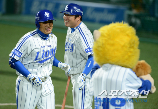 삼성 이승엽이 6회말 좌중간 솔로홈런을 터뜨린 뒤 최형우의 환영을 받고 있다. 대구=허상욱 기자 wook@sportschosun.com