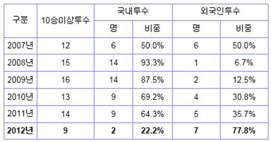 -> 단한명의 타자없이 16명의 외국인선수 엔트리가 투수로 채워졌고 2011년보다 더욱 강력해진 모습으로 돌아온 외국인투수들은 리그를 지배하고 있다. 반면 김광현, 류현진, 윤석민의 토종 에이스들은 부상과 부진, 불운에 시즌내내 시달리며10승 달성에 어려워진 모습이다.