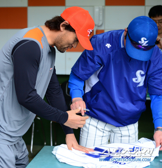 한화 박찬호가 유니폼 상의를 들고 성큼성큼 다가와 류 감독에게 인사를 하더니 유니폼을 내밀며 사인을 해달라고 요청한 것이다.