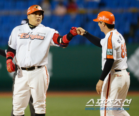 12일 대전구장에서 2012 프로야구 삼성과 한화의 경기가 열렸다. 1회말 1사 1,2루 한화 김태균이 1타점 안타를 치고 이영우 코치의 축하를 받고 있다. 대전=정재근 기자 cjg@sportschosun.com/2012.09.12/ |