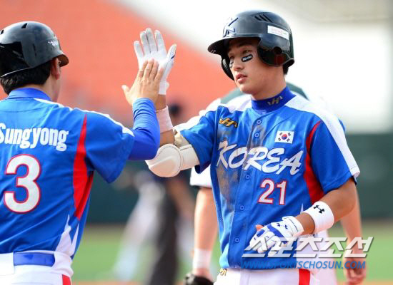 두산이 2013년 신인 7명과 입단 계약을 마쳤다. 1라운드 지명을 받은 북일고 외야수 김인태가 세계청소년선수권대회 호주전에서 적시타를 날린 뒤 1루코치와 하이파이브를 하고 있다. 송정헌 기자 songs@sportschosun.com