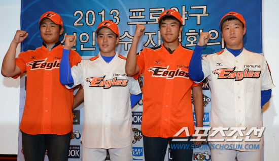 2013 프로야구 신인선수 지명회의가 20일 서울 역삼동 르네상스 서울호텔에서 열렸다. 한화에 지명된 조지훈, 김강래, 한승택, 이충호(왼쪽부터)이 포즈를 취하고 있다. 허상욱 기자 wook@sportschosun.com