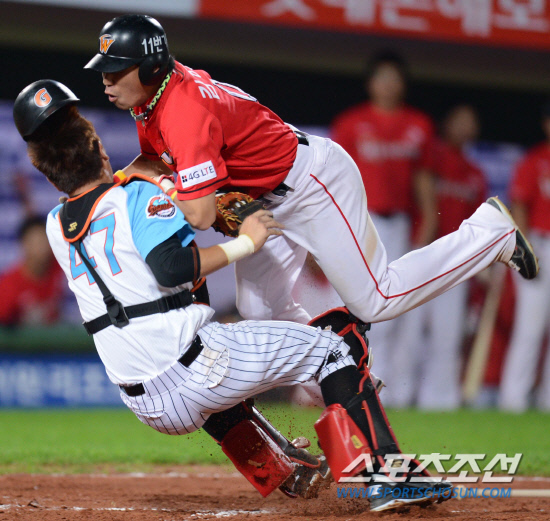 2012 프로야구에서 현재 1,5게임차로 2위와 3위를 랭크하고 있는 롯데와 SK의 경기가 18일 사직 야구장에서 열렸다. 7회초 1사 조인성의 좌전안타때 2루주자 김강민이 홈에 쇄도 했으나 롯데 포수 강민호의 블로킹에 막혀 아웃되고 있다. 부산=최문영 기자 deer@sportschosun.com