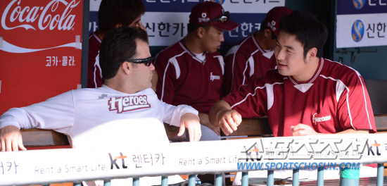19일 오후 서울 잠실야구장에서 2012 프로야구 넥센과 LG의 경기가 열렸다. 시합 전 넥센 나이트와 박병호가 이야기를 나누고 있다. 잠실=김경민 기자 kyungmin@sportschosun.com / 2012.09.19.