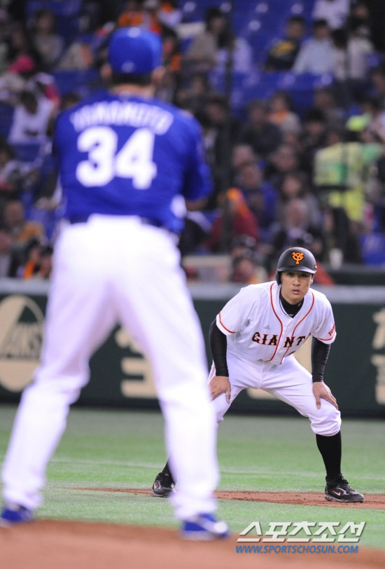 2008년 4월 2일 도쿄돔에서 벌어진 요미우리-주니치전. 2회 선두타자로 나와 중전 안타를 친 이승엽이 주니치 선발 야마모토와 신경전을 벌이고 있다. 스포츠조선 DB