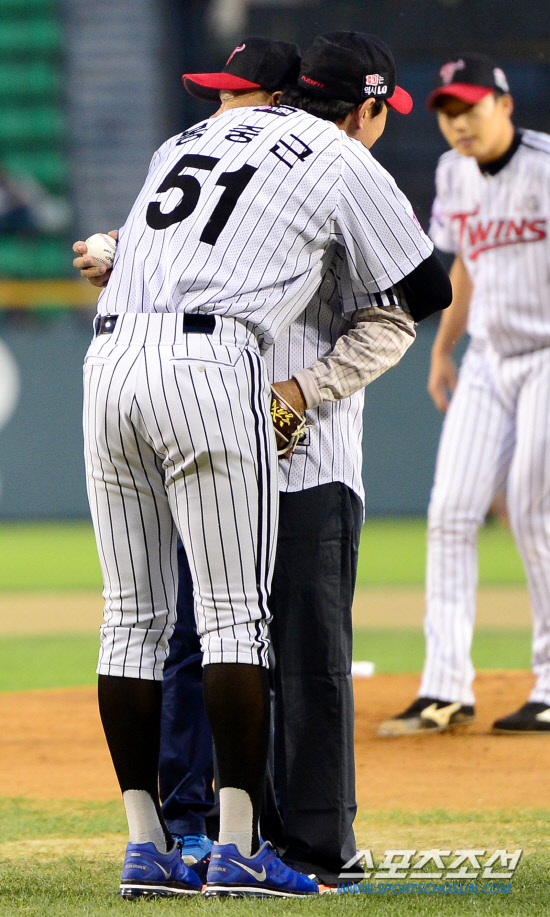 21일 잠실야구장에서 열린 프로야구 LG와 롯데의 경기에서 경기 전 LG 봉중근의 아버지 봉동식 씨가 시구를 했다. 시구를 마친 아버지가 밝은 표정으로 봉중근을 바라보고 있다. 잠실=송정헌 기자 songs@sportschosun.com/2012.9.21 |