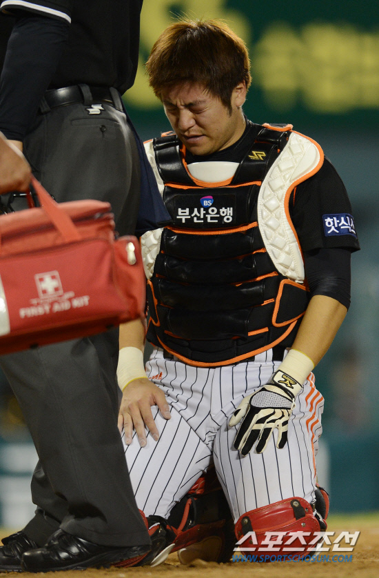 8일 잠실구장에서 2012 프로야구 준플레이오프 1차전 롯데와 두산의 경기가 열렸다. 7회말 1사 2루 두산 오재원의 1타점 2루타 때 홈에서 부상을 당한 롯데 포수 강민호가 고통스러워하고 있다. 강민호는 결국 용덕한으로 교체됐다. 잠실=정재근 기자 cjg@sportschosun.com