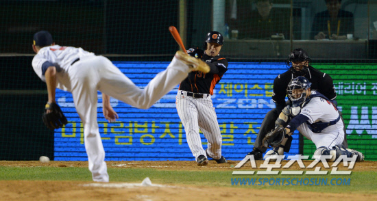 이종욱의 적시 2루타로 1점차로 추격한 상황. 2사 2루에서 롯데 배터리는 김현수를 고의 4구로 거르고 윤석민을 택했다. 큰경기 경험 부족의 4번타자. 진땀나는 동점 찬스. 가슴떨리는 압박감을 송승준이 덜어줬다. 1B1S에서 견제 아웃을 노린 기습 1루견제가 뒤로 빠지면서 2루주자가 홈을 밟으며 동점주자가 됐다. 3-3. 홀가분해진 윤석민은 송승준의 3구째 바깥쪽 커브를 가볍게 밀어 역전 중전 적시타를 터뜨린 뒤 오른손을 치켜들었다.