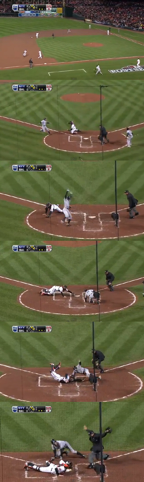 볼디모어 관중은 야유를 퍼부었지만 심판은 이치로가 3피트(약 91cm)를 벗어나지 않았다고 판단했다. 2루에 먼저 도착해 홈 접전을 지켜본 카노는 타점을 만들어준 이치로에게 큰 박수를 보냈다.