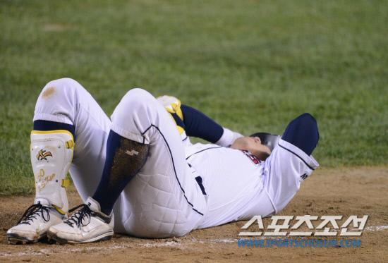 두산 김현수가 8일 롯데와의 준플레이오프 1차전에서 9회 자신의 타구가 1루수 직선아웃이 되며 더블아웃 처리되자 머리를 감싸안은 채 그라운드에 누워 있다. 잠실=김경민 기자 kyungmin@sportschosun.com