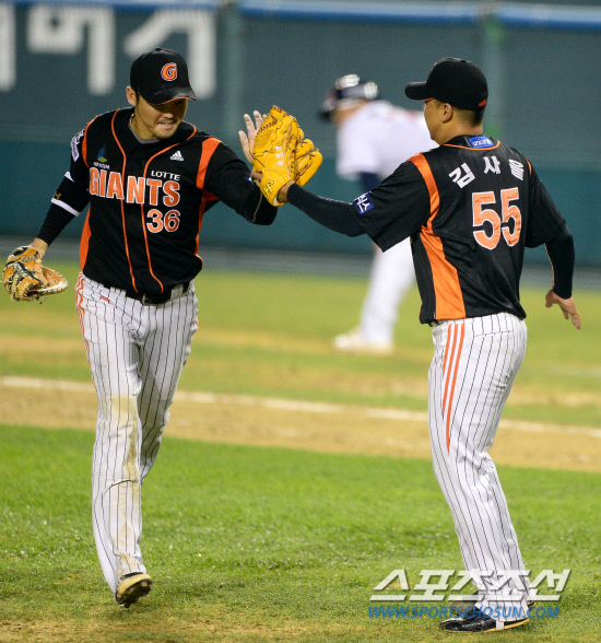 두산베어스와 롯데자이언츠가 8일 오후 잠실야구장에서 준PO 1차전 경기를 가졌다. 9회 1사 1,2루에서 두산 김현수의 볼을 직접 잡아 병살 처리한 롯데 박종윤이 이닝을 마치고 김사율과 하이파이브를 나누고 있다.잠실=송정헌 기자 songs@sportschosun.com