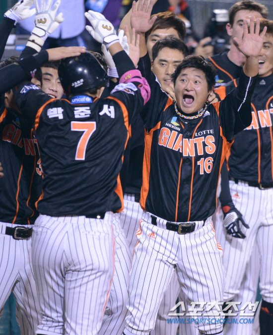 8일 오후 서울 잠실야구장에서 2012 준플레이오프 1차전 롯데와 두산의 경기가 열렸다. 8회초 1사 1루서 대타로 나선 롯데 박준서가 우중월 2점 홈런을 친 후 손용석 등 동료들과 하이파이브를 나누고 있다. 잠실=김경민 기자 kyungmin@sportschosun.com / 2012.10.08.
