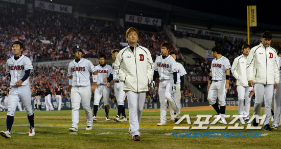 | 9일 잠실구장에서 2012 프로야구 준플레이오프 2차전 롯데와 두산의 경기가 열렸다. 이틀 연속 역전패 당하며 벼랑끝 위기에 몰린 두산 선수들이 허탈한 표정으로 그라운드를 빠져나오고 있다. 잠실=정재근 기자 cjg@sportschosun.com/2012.10.08/ |