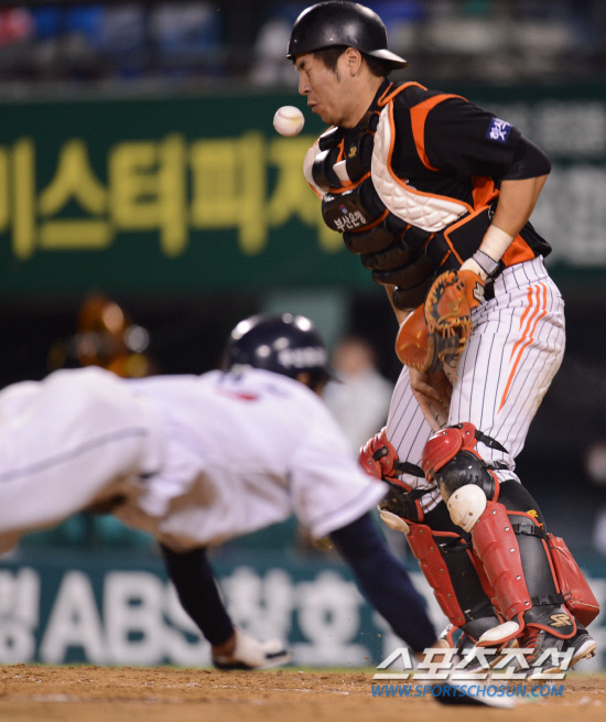 2012 프로야구 준플레이오프 1차전 두산과 롯데의 경기가 8일 잠실야구장에서 열렸다. 롯데 포수 강민호가 7회말 1사 2루 오재원의 중전 안타때 홈으로 쇄도하는 2루 주자 김재호를 블로킹 하다가 송구에 얼굴을 가격 당하고 있다. 잠실=최문영 기자 deer@sportschosun.com /2012.10.08/