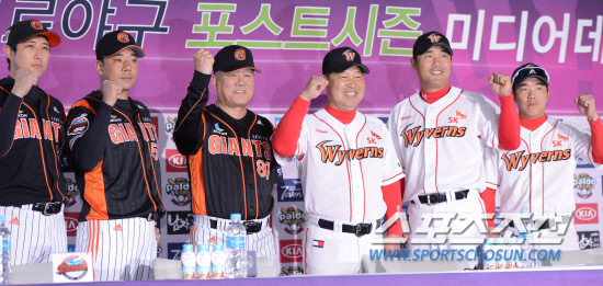 2012 플레이오프에서 격돌하는 SK와 롯데가 16일 열리는 1차전을 앞두고 미디어데이를 열었다. 15일 오후 인천 문학구장 1루 특설무대에서 열린 미디어데이 행사에서 양승호, 이만수 양팀 감독과 대표선수들이 파이팅을 외치고있다. 인천=최문영 기자 deer@sportschosun.com /2012.10.15/