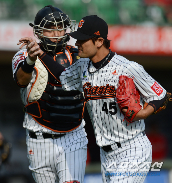 20일 부산구장에서 SK와 롯데의 2012 프로야구 플레이오프 4차전이 열렸다. 3회초 무사 1,2루의 위기에서 선발 진명호에 이어 등판한 이정민이 무실점으로 이닝을 마치고 내려오며 강민호 포수와 하이파이브를 하고 있다. 부산=정재근 기자 cjg@sportschosun.com/2012.10.20/