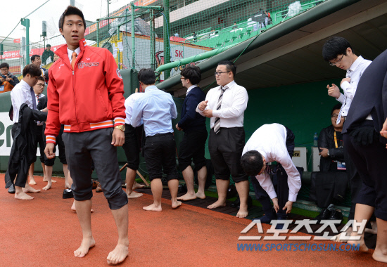 이날 SK와 롯데 선수들은 실내에서 가볍게 타격훈련을 소화했다. 성공적인 그라운드 정비를 위해 그라운드 훈련은 최소화했다. SK 선수들의 훈련이 한창이던 오후 3시30분쯤, 그라운드엔 정장을 입은 사내들이 쏟아져 나왔다. 관중석에서 팬들의 안전을 책임지는 진행요원들이었다. 빠른 작업을 위해 이들까지 동원돼 방수포를 걷어내는 작업을 했다.