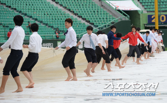 빅리그에서나 볼 법한 대형 방수포는 이미 인천 문학구장의 자랑이다. 워낙 크기에 현장 진행요원 20여명이 붙어야 설치와 철수가 가능하다. 그리고 빠르고 정확한 설치를 위해 따로 메뉴얼이 있을 정도다.