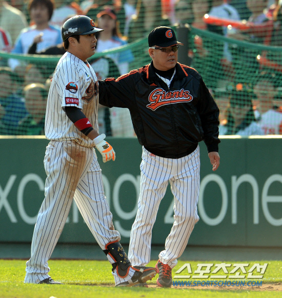 프로야구 SK와 롯데의 플레이오프 4차전 경기가 20일 부산 사직야구장에서 펼쳐졌다. 양승호 감독이 문규현이 5회말 1사 1루에서 아웃판정을 당하고 억울해 하자 덕아웃으로 끌고가고 있다. 부산=전준엽 기자 noodle@sportschosun.com/2012.10.20/ |