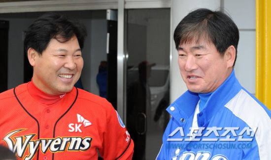 삼성과 SK가 2010년부터 3년 연속 한국시리즈에서 만나게 됐다. 지난해 한국시리즈 미디어데이 행사에서 밝은 표정으로 이야기를 나누고 있는 이만수 감독과 류중일 감독. 스포츠조선 DB