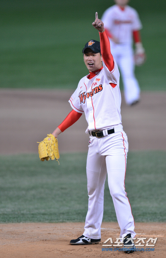 22일 오후 인천 문학구장에서 2012 프로야구 플레이오프 5차전 롯데와 SK의 경기가 열렸다. 1회초 2사서 SK 김광현이 롯데 손아섭의 파울 플라이를 가리키고 있다. 인천= 김경민 기자 kyungmin@sportschosun.com / 2012.10.22.