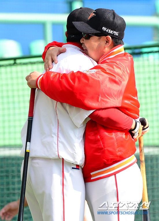 28일 인천구장에서 열리는 2012 프로야구 한국시리즈 삼성과 SK의 3차전을 앞두고 SK 선수들이 그라운드에서 훈련을 했다. 이만수 감독이 훈련 중인 이호준과 포옹을 하고 있다. 인천=정재근 기자 cjg@sportschosun.com/2012.10.28/