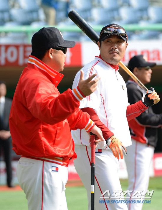 28일 인천구장에서 열리는 2012 프로야구 한국시리즈 삼성과 SK의 3차전을 앞두고 SK 선수들이 그라운드에서 훈련을 했다. 이만수 감독이 훈련 중인 이호준과 이야기를 나누고 있다. 인천=정재근 기자 cjg@sportschosun.com/2012.10.28/ |