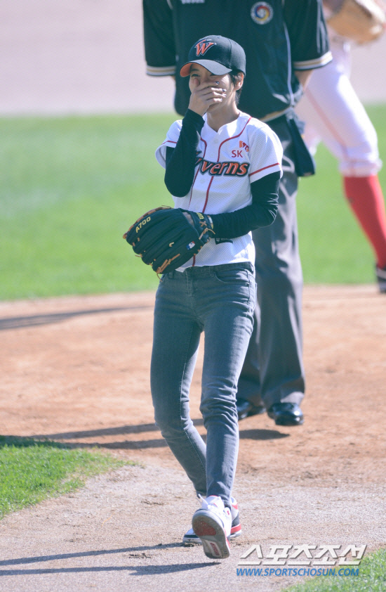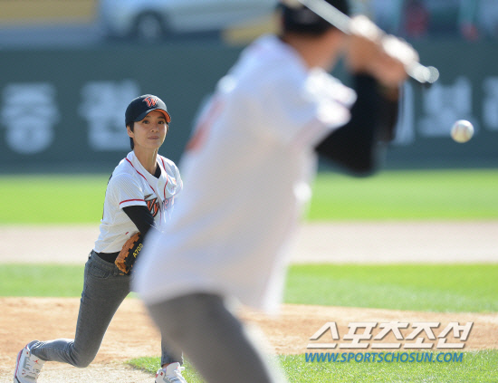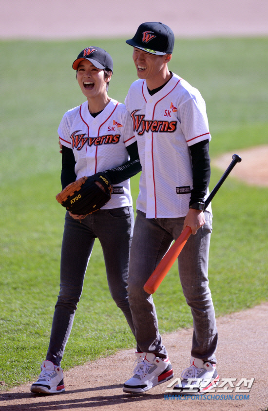 28일 오후 인천 문학구장에서 2012 프로야구 한국시리즈 3차전 삼성과 SK의 경기가 열렸다. 시합 전 시구를 마친 탤런트 정혜영이 시타를 한 남편 션과 그라운드를 빠져나오고 있다.