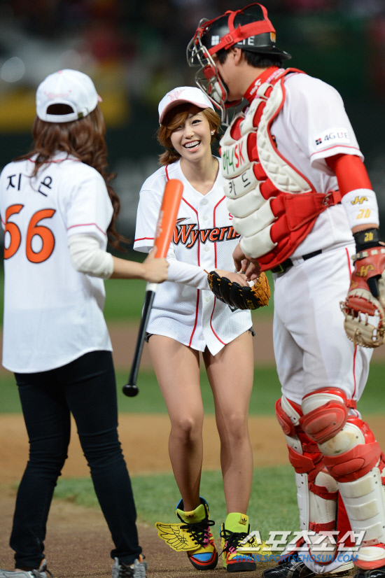 29일 인천구장에서 2012 프로야구 한국시리즈 삼성과 SK의 4차전이 열렸다. 경기 전 걸그룹 시크릿의 전효성과 송지은이 시구와 시타를 했다. 시구시타를 마친 전효성 송지은이 밝은 표정으로 내려오고 있다.