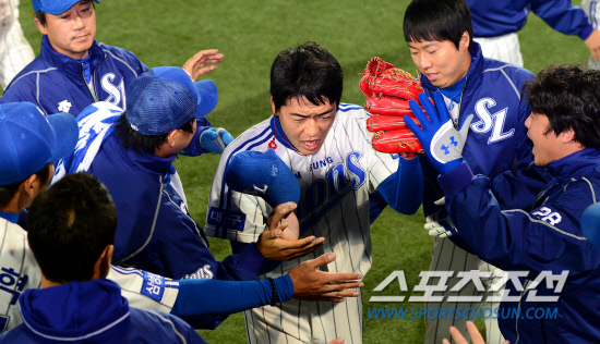 그런데 지금껏 '아기사자' 심창민은 아직까지 등장음악이 없었다. 대부분의 삼성 불펜투수들이 마찬가지다. 모두 같은 곡이 나온다. 필승조 권 혁, 안지만이 마운드에 오를 때도 <사나이 순정>이라는 트로트가 흘러 나온다. 오직 '끝판대장' 오승환만이 종소리 이후 울려 퍼지는 웅장한 <라젠카 세이브 어스>라는 곡에 맞춰 등판할 뿐이다.