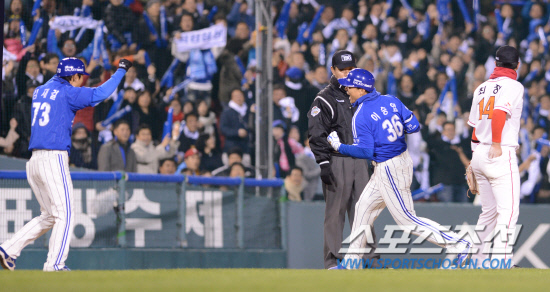 2012 팔도프로야구 한국시리즈 6차전 삼성과 SK의 경기가 1일 잠실야구장에서 열렸다. 삼성 이승엽이 4회초 2사 만루에서 싹쓸이 3타점 우전 적시타 친후 3루에서 포효하고 있다. 잠실=최문영 기자 deer@sportschosun.com
