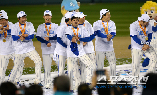 우승 트로피를 받으러 단상 앞으로 나오자 벌떼처럼 달려들어 이승엽의 머리와 얼굴에 샴페인을 뿌렸다. 투수조와 타자조가 교묘하게 조를 나눠 짜여진 공격을 했다. 뿌리는 게 아니라 숫제 들이붓는 수준이었다. 특히 장난꾸러기 박석민은 샴페인을 한가득 입에 머금었다가 이승엽의 얼굴에 가차없이 뿜어댔다.